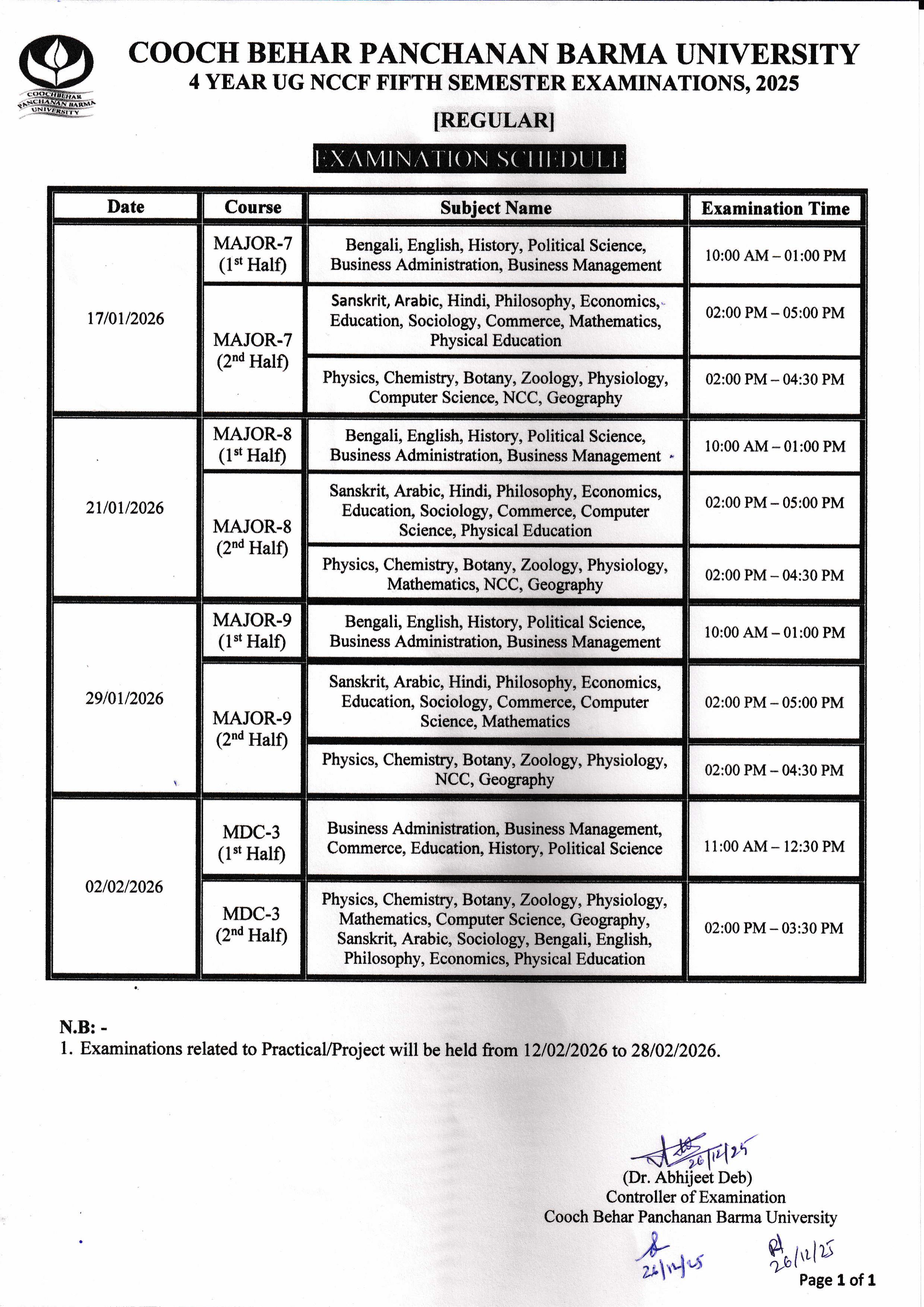 4 Year UG NCCF Fifth Semester Examinations 2025